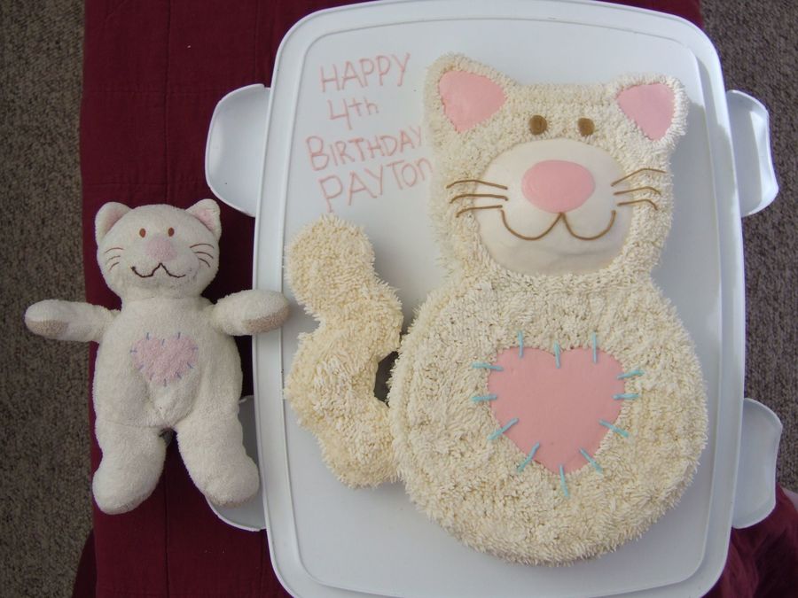 For my daughter's 4th birthday. She has had this cat since she was 3 mos old and it goes everywhere with her! It is her best friend in the world! Tail is mini cupcakes iced, I used a 6" and 8" cake for the head and body and trimmed regular cupcakes for the ears.