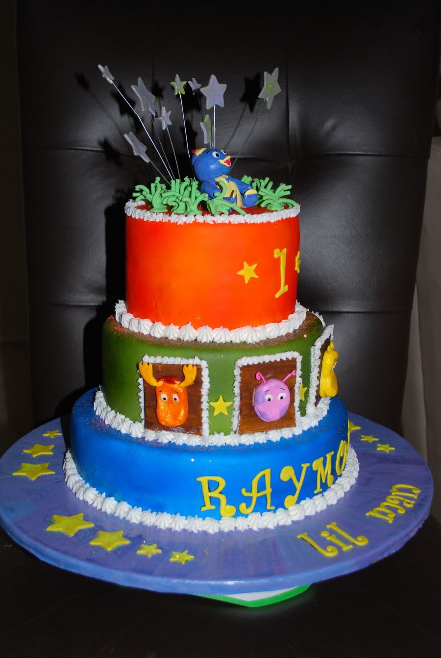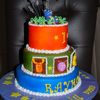Bottom is a 12" round vanilla cake w/ strawberry filling, middle is 8" chocolate cake w/ strawberry filling, top is vanilla cake w/ strawberry filling, all iced in MMF. Characters, grass, stars, and letters/number are made out of gumpaste, RI borders, fondant cake board, all tiers are airbrushed and dusted with disco dust.