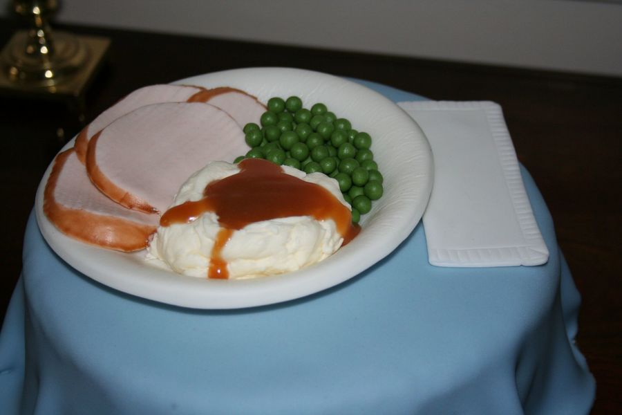 This was my first attempt at using fondant for a cake. The table cloth didn't come out as nice as I would have liked. The turkey , peas, plate, and napkin are made from fondant. The mashed potatoes are made from icing with extra powdered sugar added to make it look a bit stiffer.