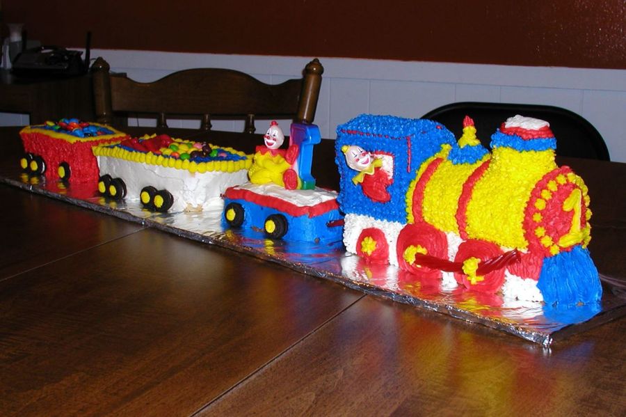 I used the Wilton cake pan and then used mini bread pans for the fright cars. This was for my baby's 1st birthday. He got the cake with the clown and candle all to himself and LOVED it.