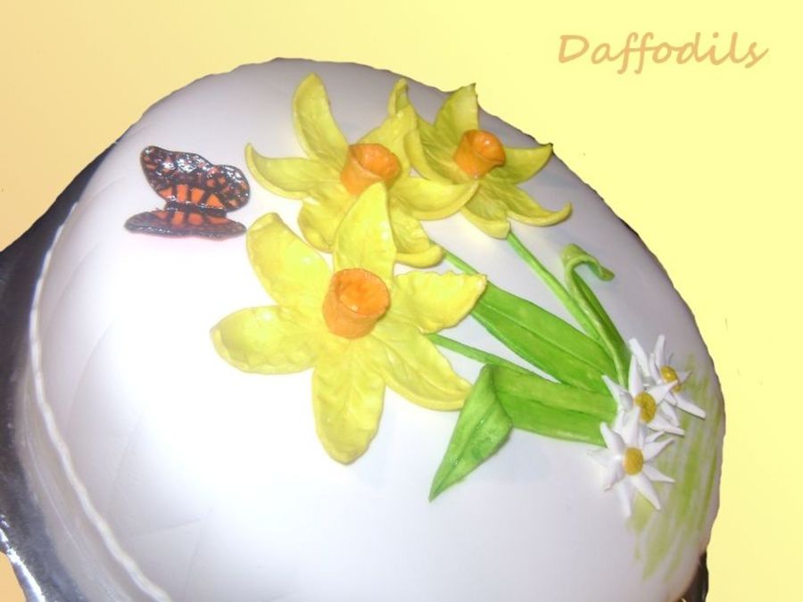 My second try at fondant daffodils. Made this as an Easter gift for the teacher's at my son's school. This was also my first try at a fondant butterfly and making the sides quilted. Thanks for looking!