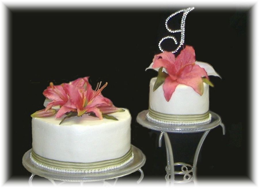 This is the cake for my best friends wedding. The lillies are silk. Icing is buttercream.