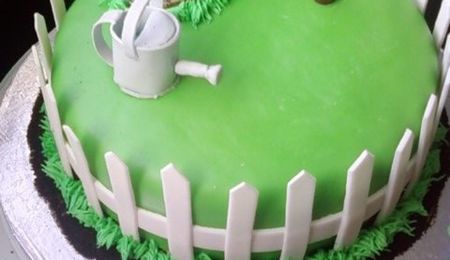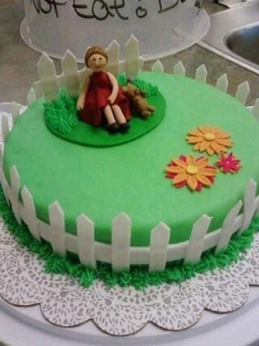 cake is covered in MMF. girl is made out of GP and fence is made out of half fondant and GP. BC grass border and GP daisies