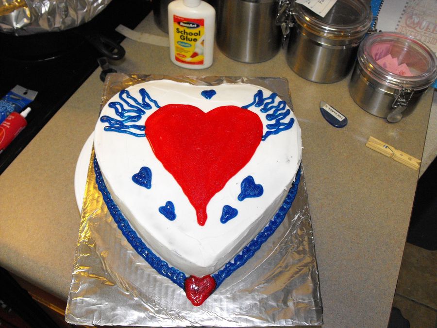 This is my "how to decorate a cake in 20 minutes" cake....lol. I only had a short amount of time between the time I got off work and when my son's school party started. I copied the design from his Valentine Notes.
