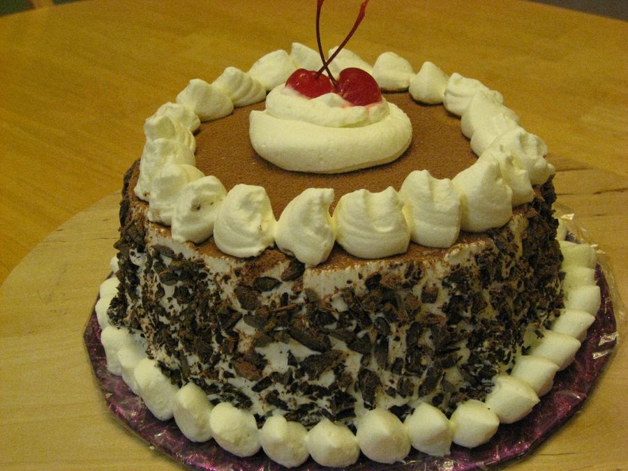Black Forest cake- Moist chocolate cake soaked in cherry juice, layered with fresh cream and cherries and finished off with more fresh cream and chocolate bits . Was delicious!