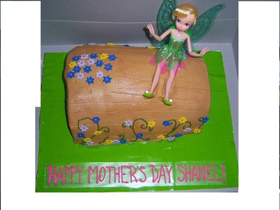 Tinkerbell sitting on a log. Log is banana wasc with scratch strawberry filling. Iced in BC with fondant flowers and BC vines. My fondant tinkerbell fell on the ground, so I had to use a plastic one instead. Thanks for looking. And than you to cupcakeluv24 for the recipe!