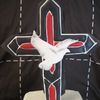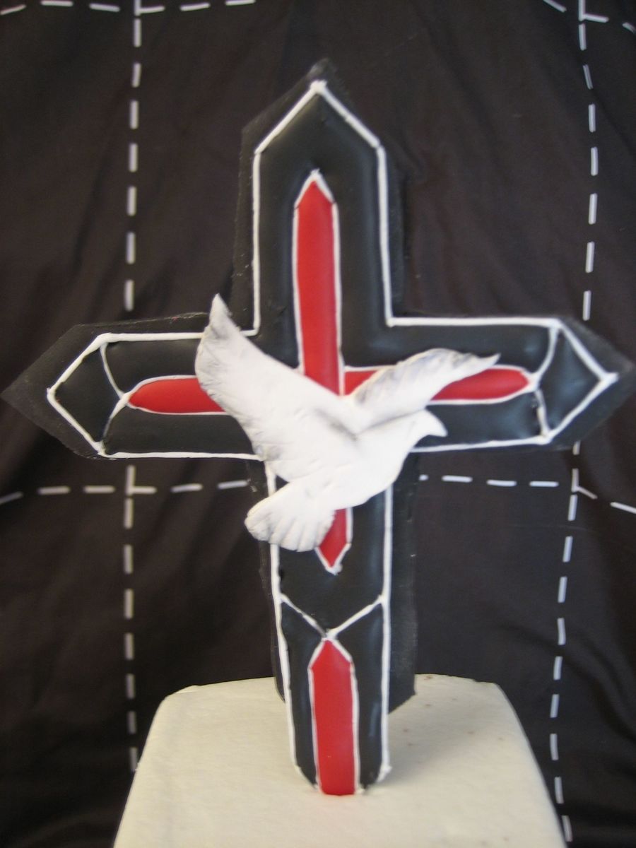 This cake was made for a boy's confirmation with the words of the 7 gifts the Holy Spirit gives you when you are confirmed. Wisdom, Understanding, Right Judgment, Knowledge, Reverence, Wonder and Awe. The cake is iced in buttercream with fondant accents and cross is edible made out of royal icing, and dove out of gum paste. Thanx for looking.