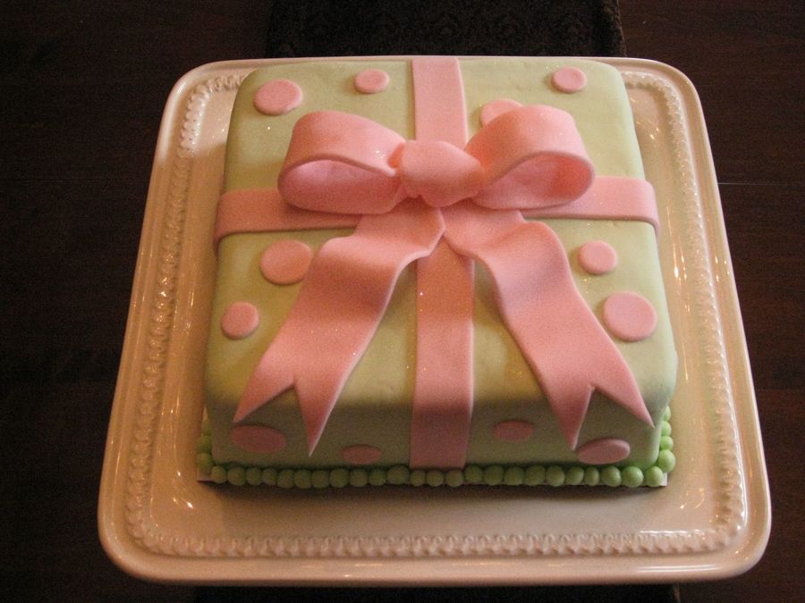 First cake for Wilton Course 3. 8-inch square WASC cake. Green is mmf, pink is WIlton Fondant. First time working with Wilton fondant. Not sure what I think of it yet... mmf is definitely tastier!