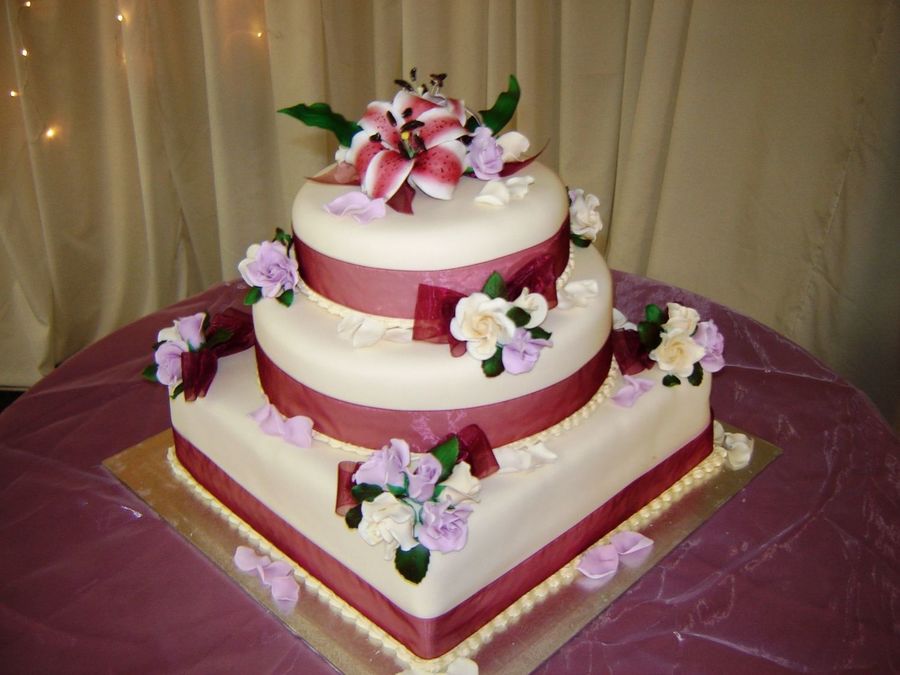 Bottom layer Rich moist chocolate, middle layer is vanilla and top layer is fruit cake. there was another 14"vanilla with b.c for serving to the guest as this couple had a christian wedding and a traditional african wedding. Star gazer lilies and roses were in cream and lilac, ribbon is burgandy. loose rose petals around the cake for decoration, cake covered in cream sugar paste. They were very happy with it all. Thank you for looking