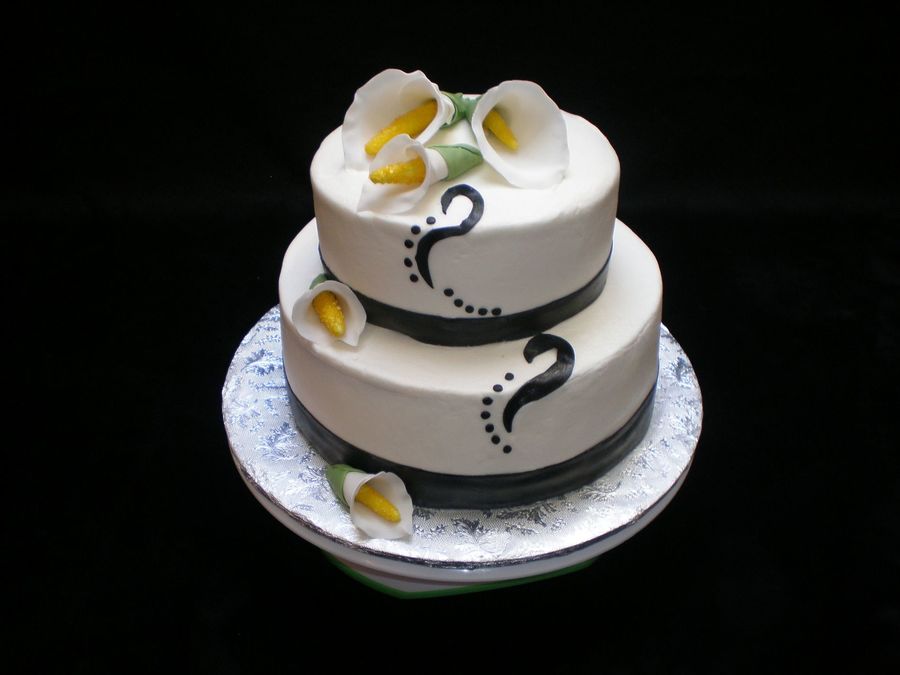 Practice cake I made at cake class. Calla lillies made from gumpaste and cake is covered in fondant as well as the ribbon
