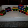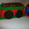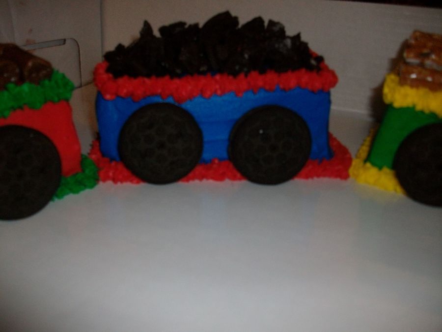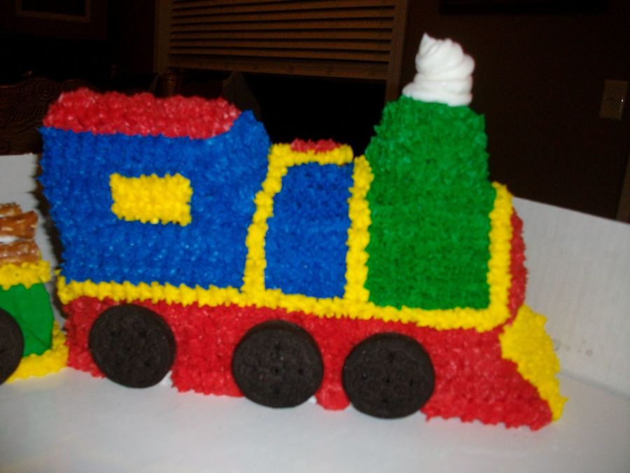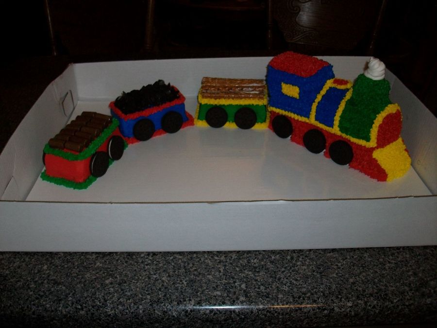 I used Wilton's 3D Train Engine Pan & 3 mini loaf pans. All BC icing. Tootsie Rolls, Crushed Oreos, and Pretzels for cargo. Inspired by schmoopy78. Thanks!