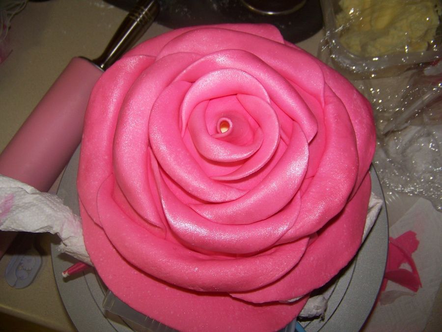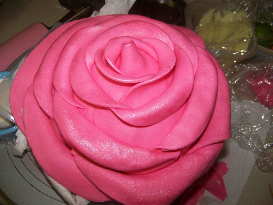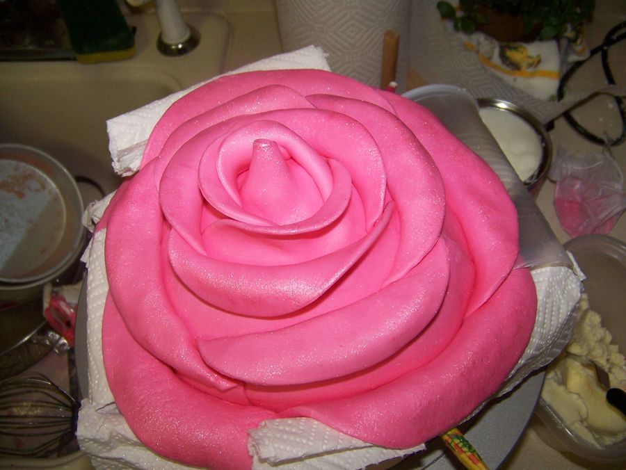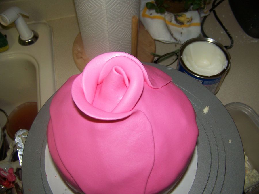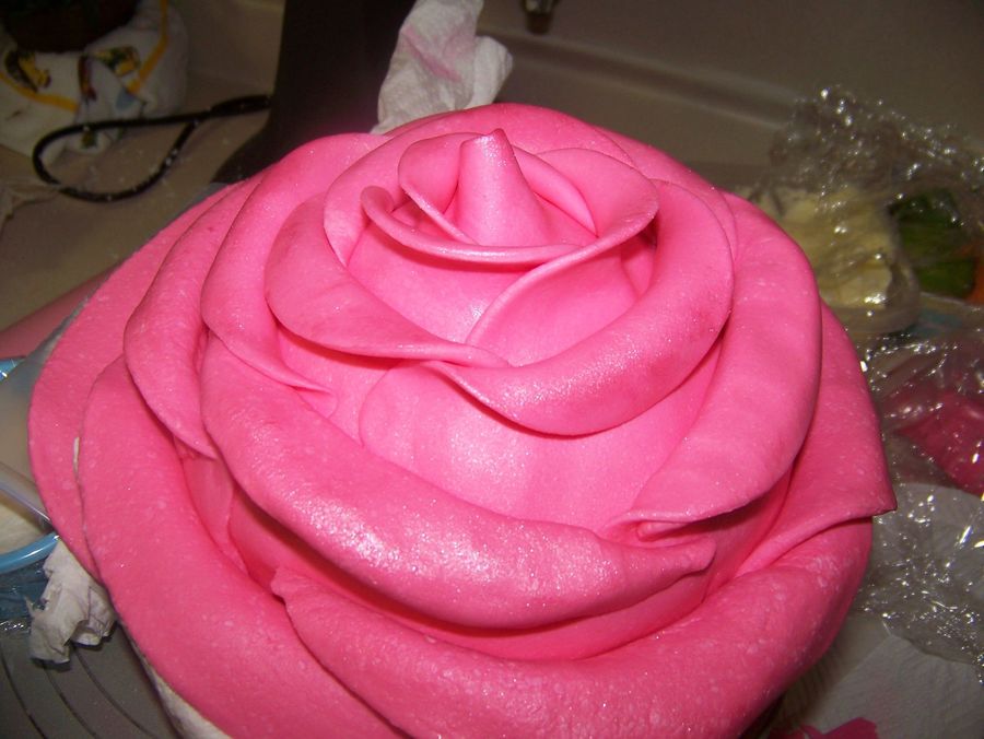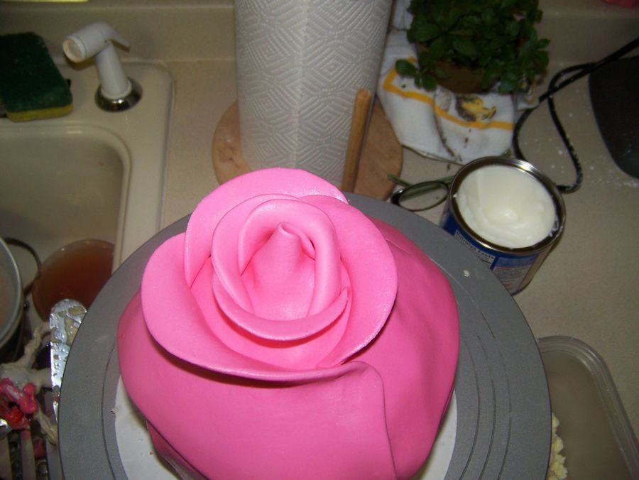 This is an 8" chocolate cake iced with white chocolate butter cream. The petals are MMF and gumpaste mixed. I saw this cake on CC on just went for it. it really isnt alot once you kget the first couple of petals on they all just fall in to place.