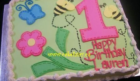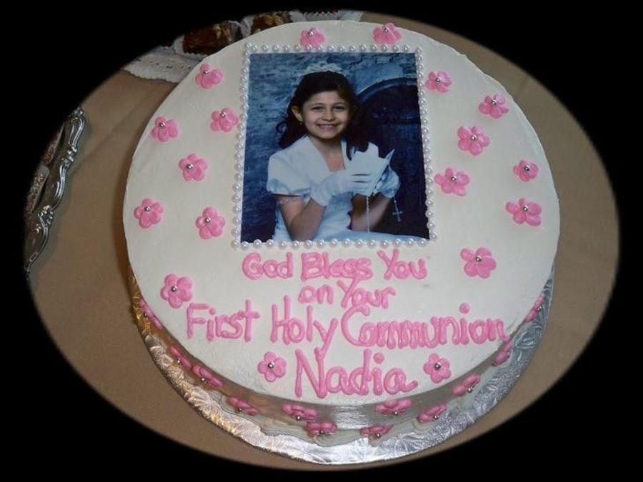First Communion cake with edible image and small pink icing flowers