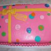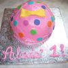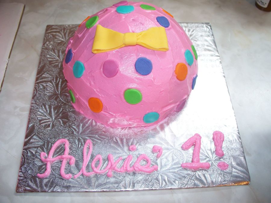 Rainbow cake covered in buttercream and rolled buttercream. Polka dots and ribbon made from rolled fondant.