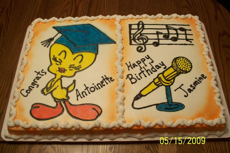 Full sheet butter cake with buttercream icing. Cake baked for dual celebration of sisters one graduating from high school and the other turning 15 the same week.