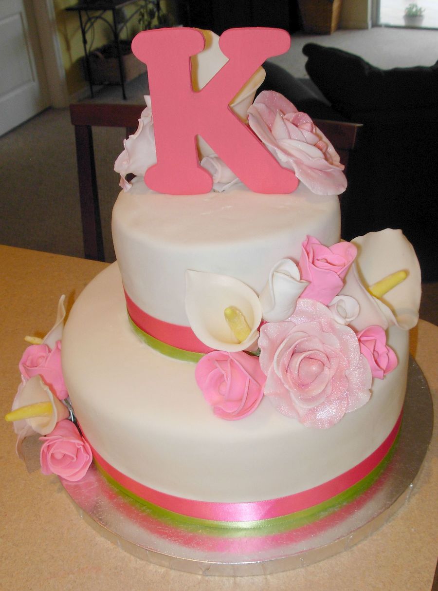 'K' monogram requested, as well as roses and callas to match bouquets. Dark chocolate fudge cake, chocolate buttercream, raspberry filling, MMF. This was my first attempt at gumpaste flowers -- I need more practice on the roses but am pretty pleased with how they came out!