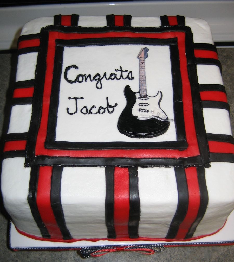 For a high school graduate who loves his guitars - has six of 'em! Just about every cake I've made recently is chocolate with caramel filling. I can do it in my sleep now...literally! I was up until 4 in the morning with this one. Stupid day job! I made the guitar with fondant/gumpaste mix and a patchwork cutter. Worked AWESOME!!! TFL!