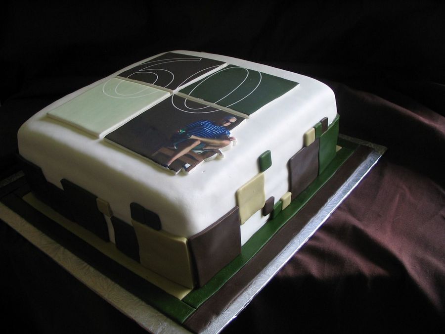 Fondant covered , Edible image of the invitation to the bd party.. Blocks the same colour as the invite.