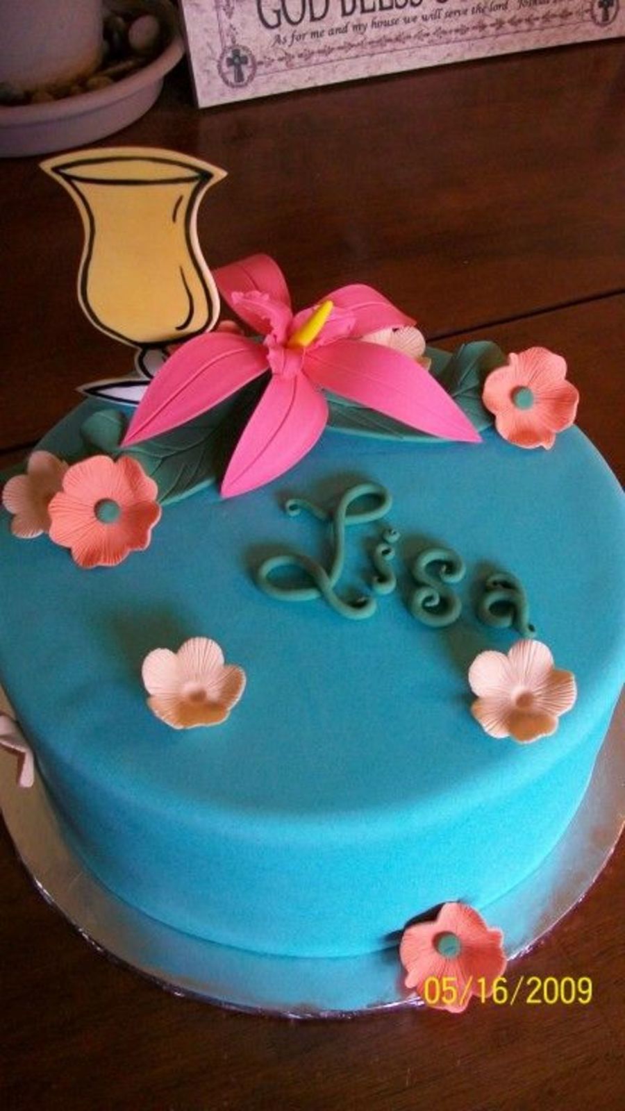 Lemon cake with strawberry preserves and buttercream and fondant icings. Gum paste decorations.
