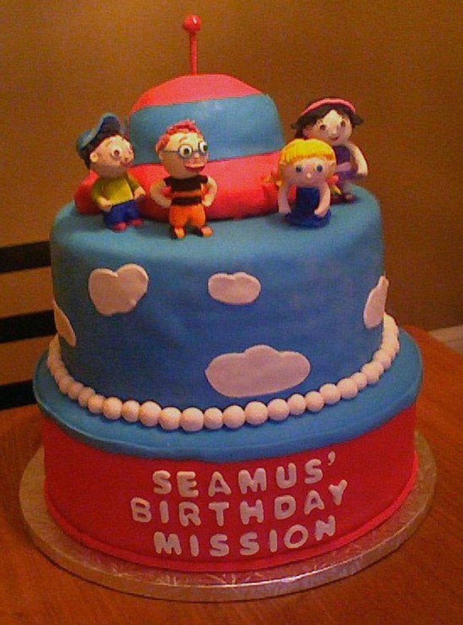 I wasn't too pleased with how the figures came out on this one, but I didn't have time to do them over. Thanks to many cakes on CC for inspiration and to Cambo for walking me through the rocket. Gumpaste figures, carved cake rocket & fondant on cake. Thanks for looking!