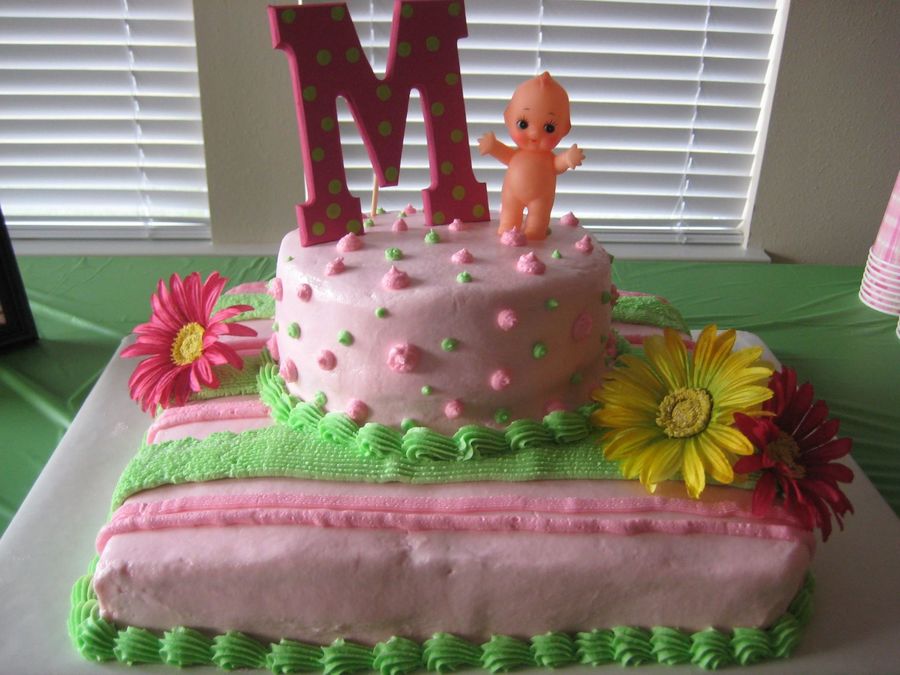 I made this for my best friends baby shower. Chocolate, Yellow and White Cakes. All buttercream. Silk Flowers. She didn't want anything too pink and girly. The shower colors were pinks and greens.