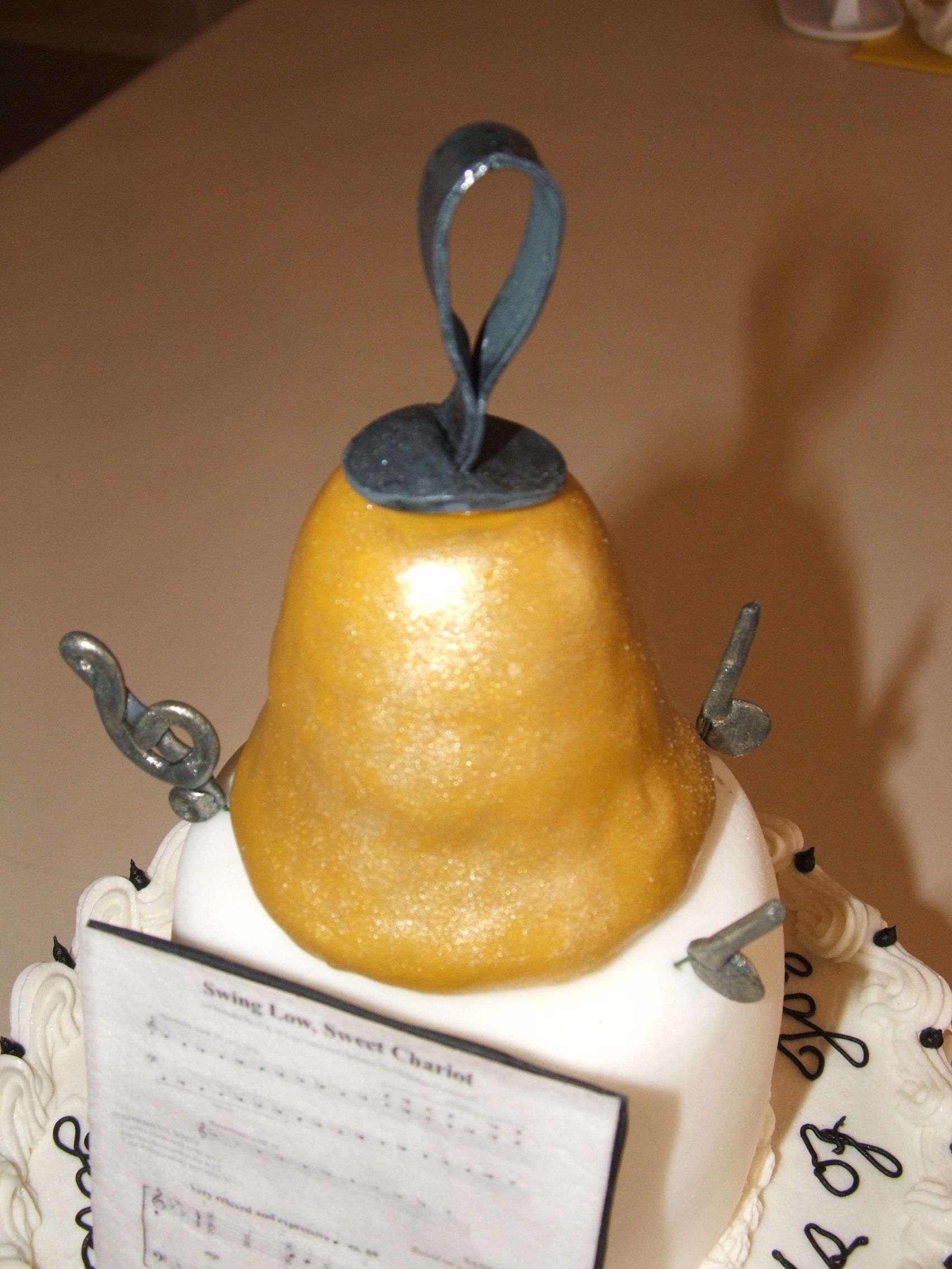 Fondant pieces on butter cream. Lemon/Raspberry Cake. Made for church cake auction for Hand Bell Choir. Bells of Joy and Joyful Ringers. TFL