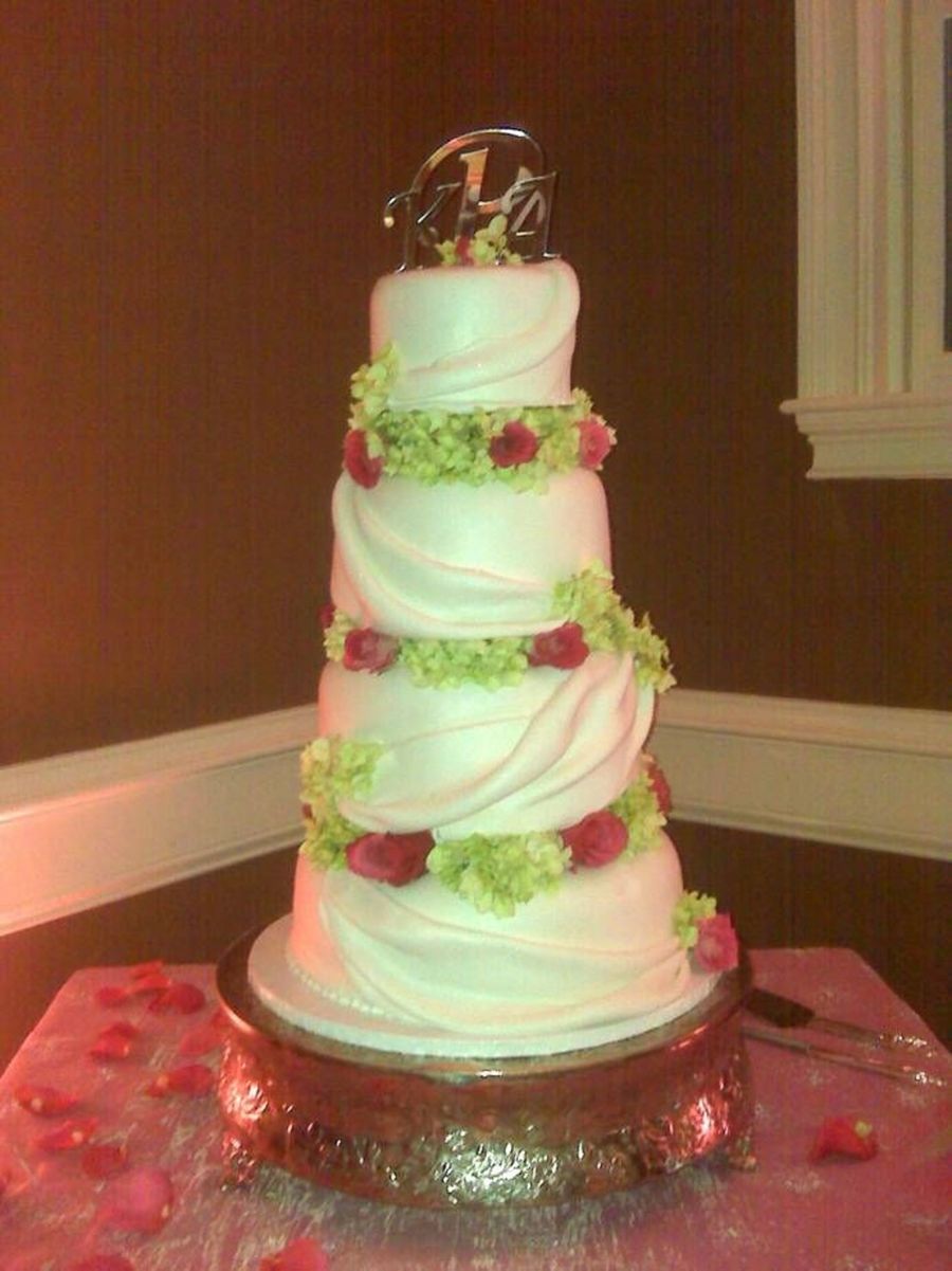 Tiered with green hydrangeas and coral roses