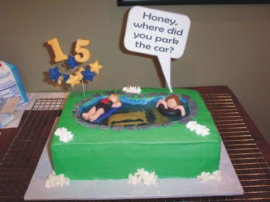 This is a Birthday cake for a 15 year old girl who was having a pool party and getting her Learner's Permit. Cake is chocolate with buttercream. decorations are MM fondant, pool water is tinted piping gel. Thanx for looking!