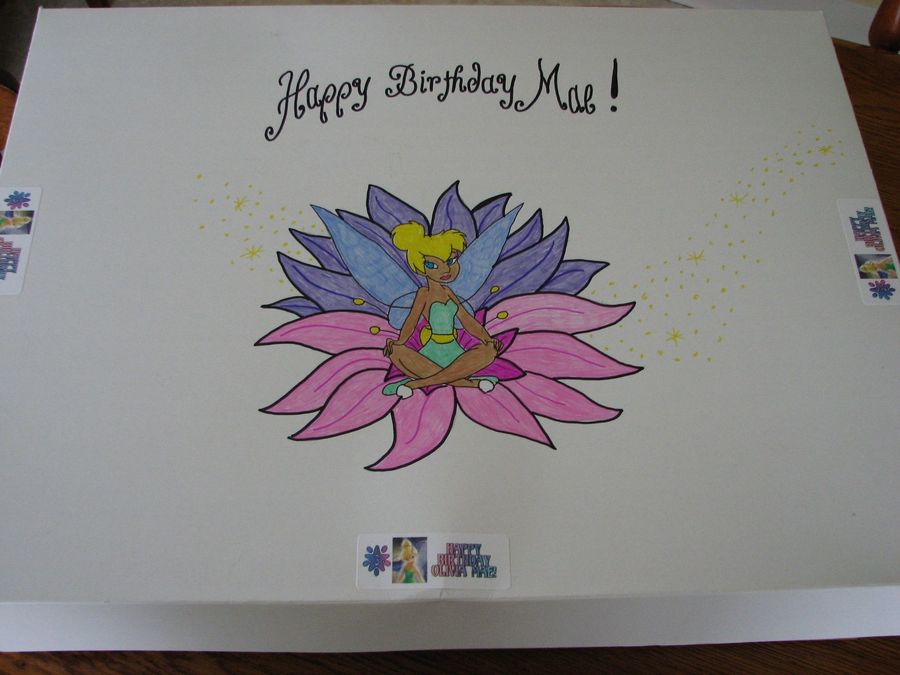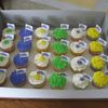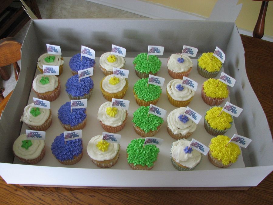 Cupcakes for my niece's 3rd birthday. Colored to match a cake her parents bought. I added little flags with Tinkerbell pictures on one side and her name on the other side. I decorated to box to match them.