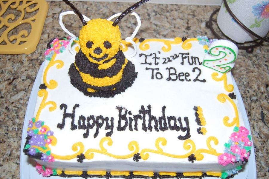 One of my daughter's birthday cakes. She loved this one page in a book about bumble bees and so I went with it. Used the mini bear 3-d pan for the bee and royal icing for the wings which I chose to leave as an outline rather than filling them in.