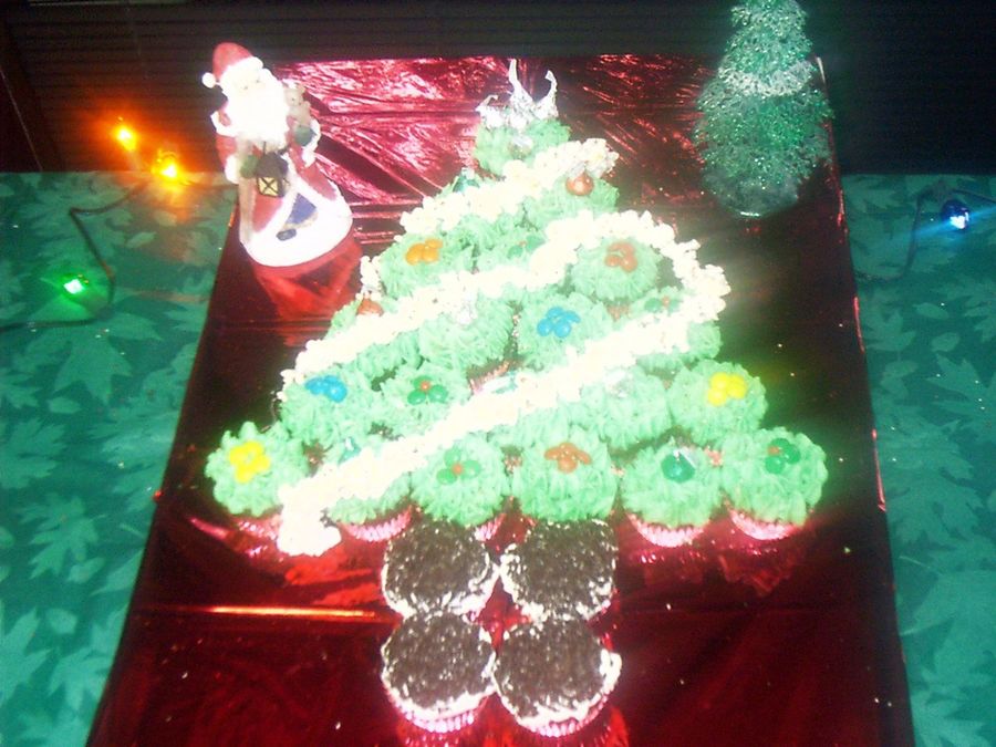 Chocolate cupcakes with buttercream frosting; m & m's and hershey kisses used for decorations and a string of popcorn for garland. Chocolate sprinkles used on tree trunk.