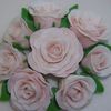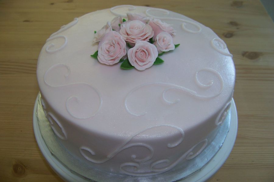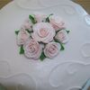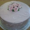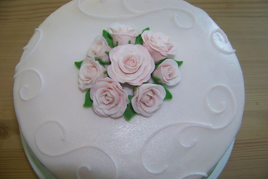 vanilla cake. iced in pale pink buttercream. fondant/gumpaste roses dusted with pearl dust.