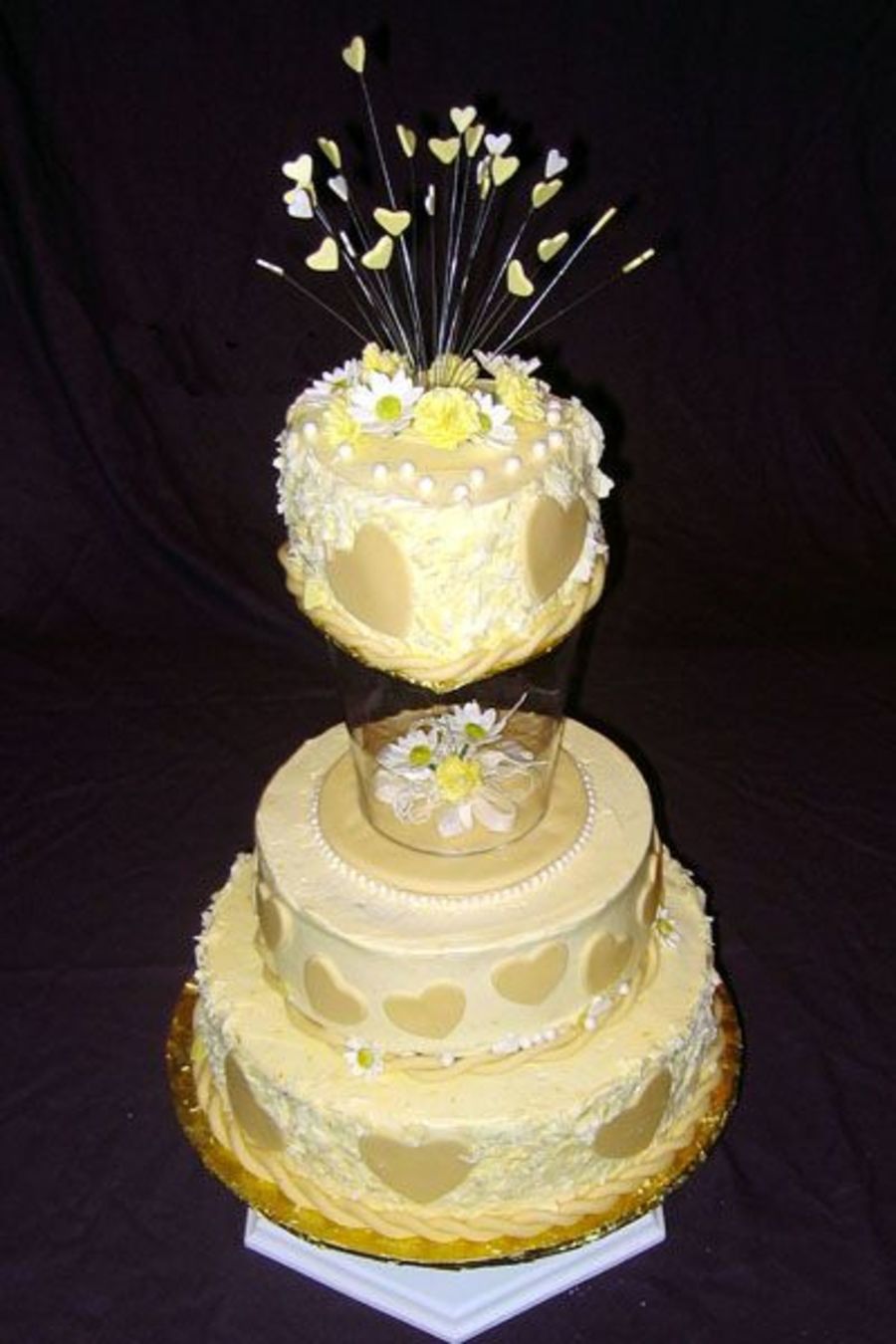 This was a lemon poppyseed cake filled with lemon curd and covered in lemon curd flavored buttercream. Decorated with white chocolate curls, marzipan hearts, cornelli lace, and gumpaste flowers and hearts.