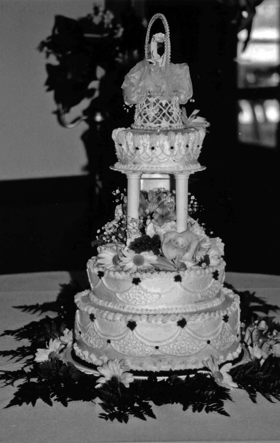 Buttercream decorated with drop-strings and filigree sections