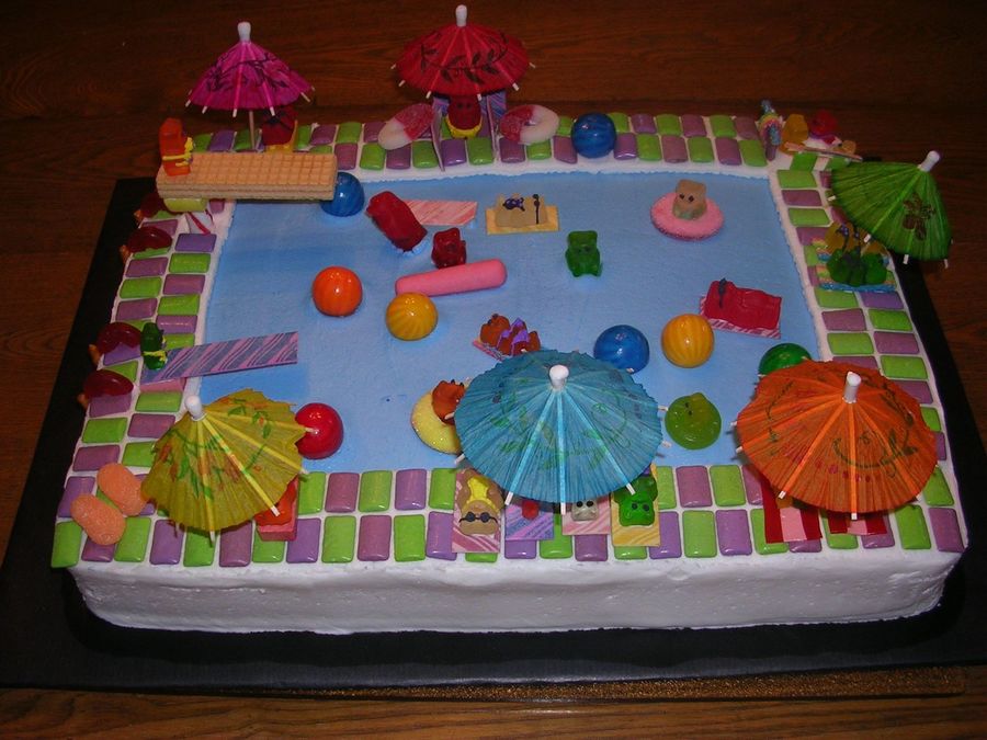 I made this cake for our family reunion in 2007. Cake is chocolate 11x15, iced in buttercream. Various candy, gum and cookies used for decorations. Sunglasses, eyes and swimsuits are piped on the gummy bears with royal icing.