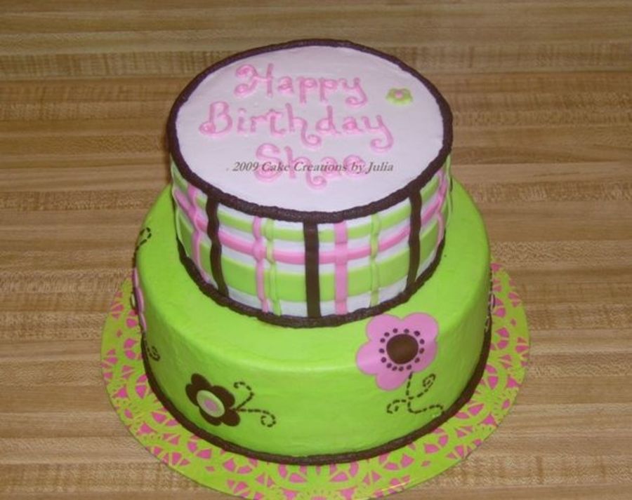 White cake with 6 and 8 inch tiers. Covered with Vanilla Icing with Chocolate borders. Flowers and plaid made of Fondant. Inspired by jaklotz1 Spring Burst cake.