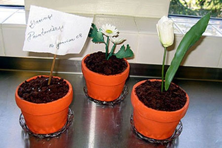 Chcolate cakes with cookie crumb soil and gumpaste flowers. The sign is rice paper and edible ink.