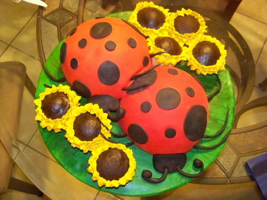 My other little niece just said "ladybugs" for her cake and gave me no other instructions. This is what I came up with. Fondant covered. I had to use cupcakes to hide some imperfections. The centers are chocolate fondant and the leaves are buttercream.