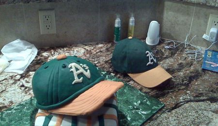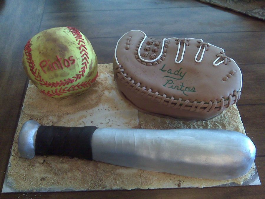 I made this cake for my daughter's softball team. She specifically requested the softball be "dirty", so I added cocoa to the top of it. The glove is a chocolate cake. The softball is a yellow cake and the bat is rice krispie treats.