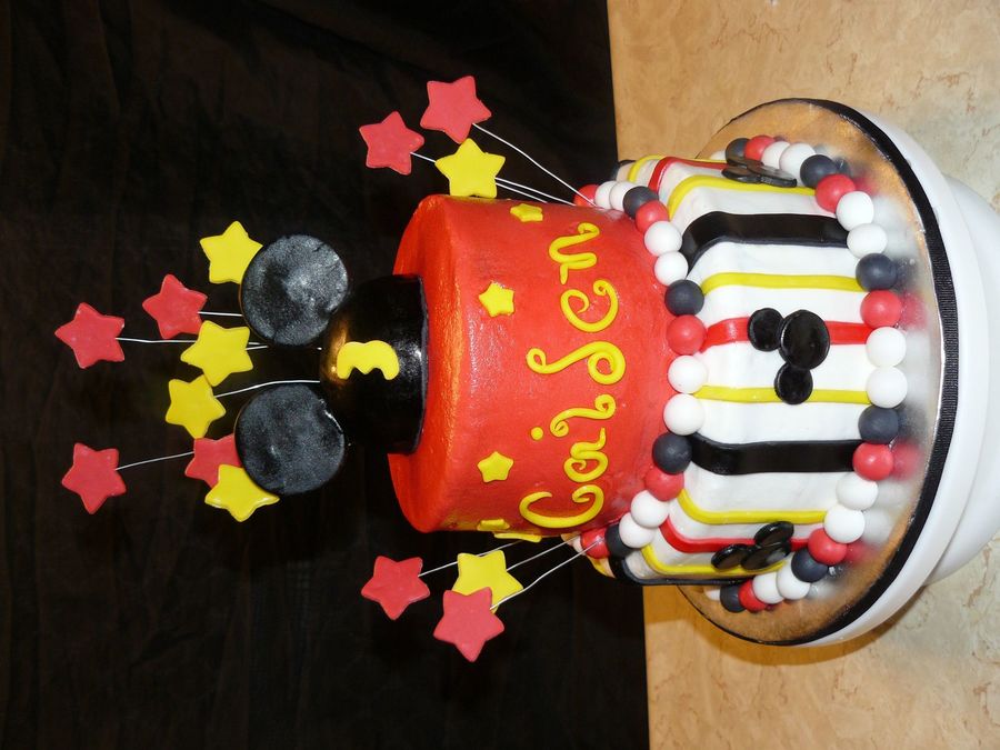 3 teir blk., yellow and red Mickey Mouse cake