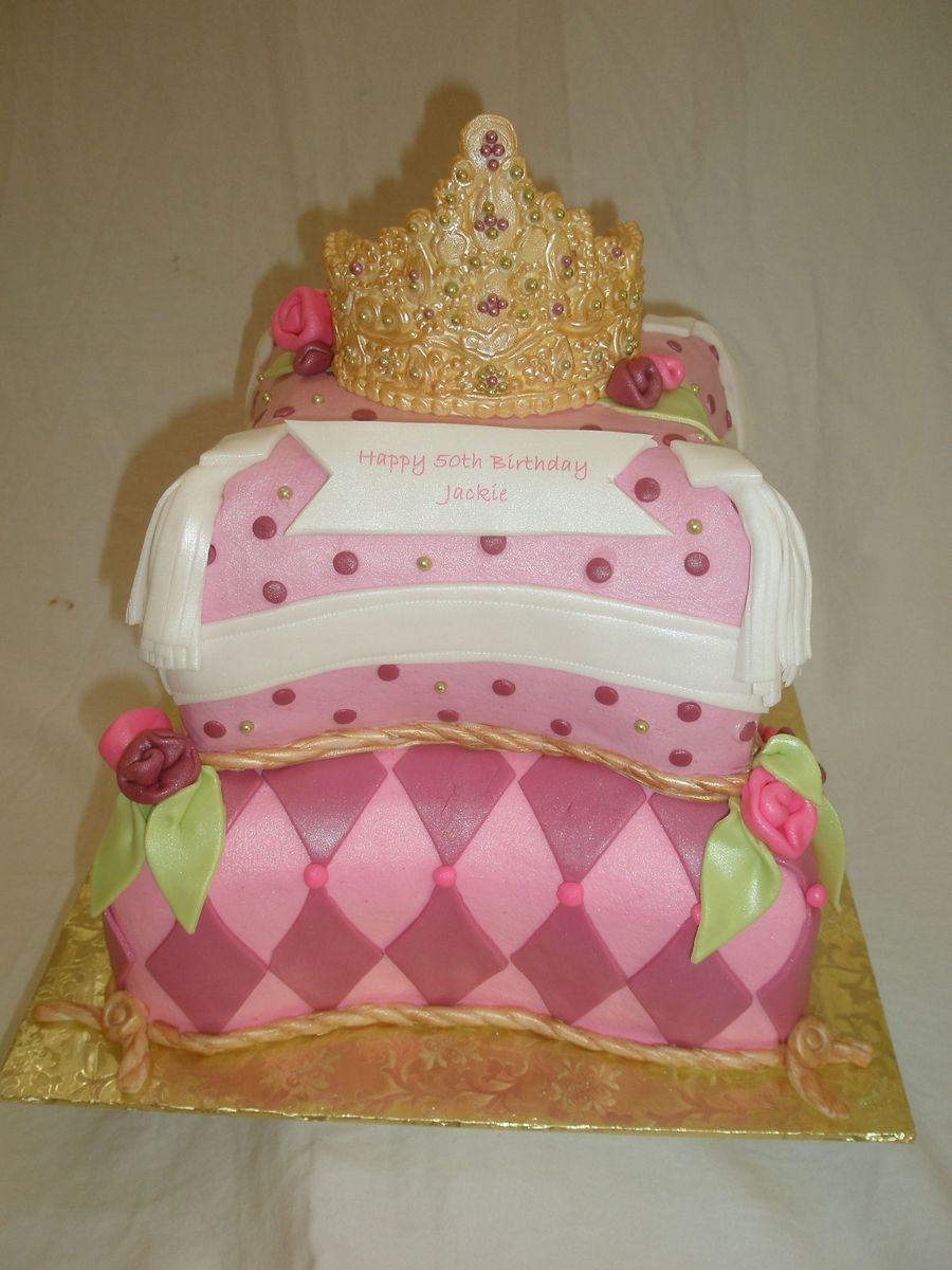Customer requested a royal looking, rosy pink queen cake for her friend turning 50. Crown is royal icing w/ perils. Both cakes iced in buttercream, covered with fondant appliques.