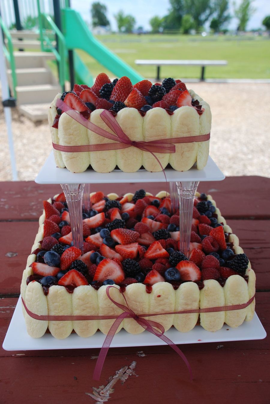 This was a vanilla cake with rasberry filling and a rasberry glaze on top, then covered in fresh fruit. Lady fingers were wrapped around the sides and tied with a ribbon. Absolutly no icing was used on this cake but it was amazingly delicious.