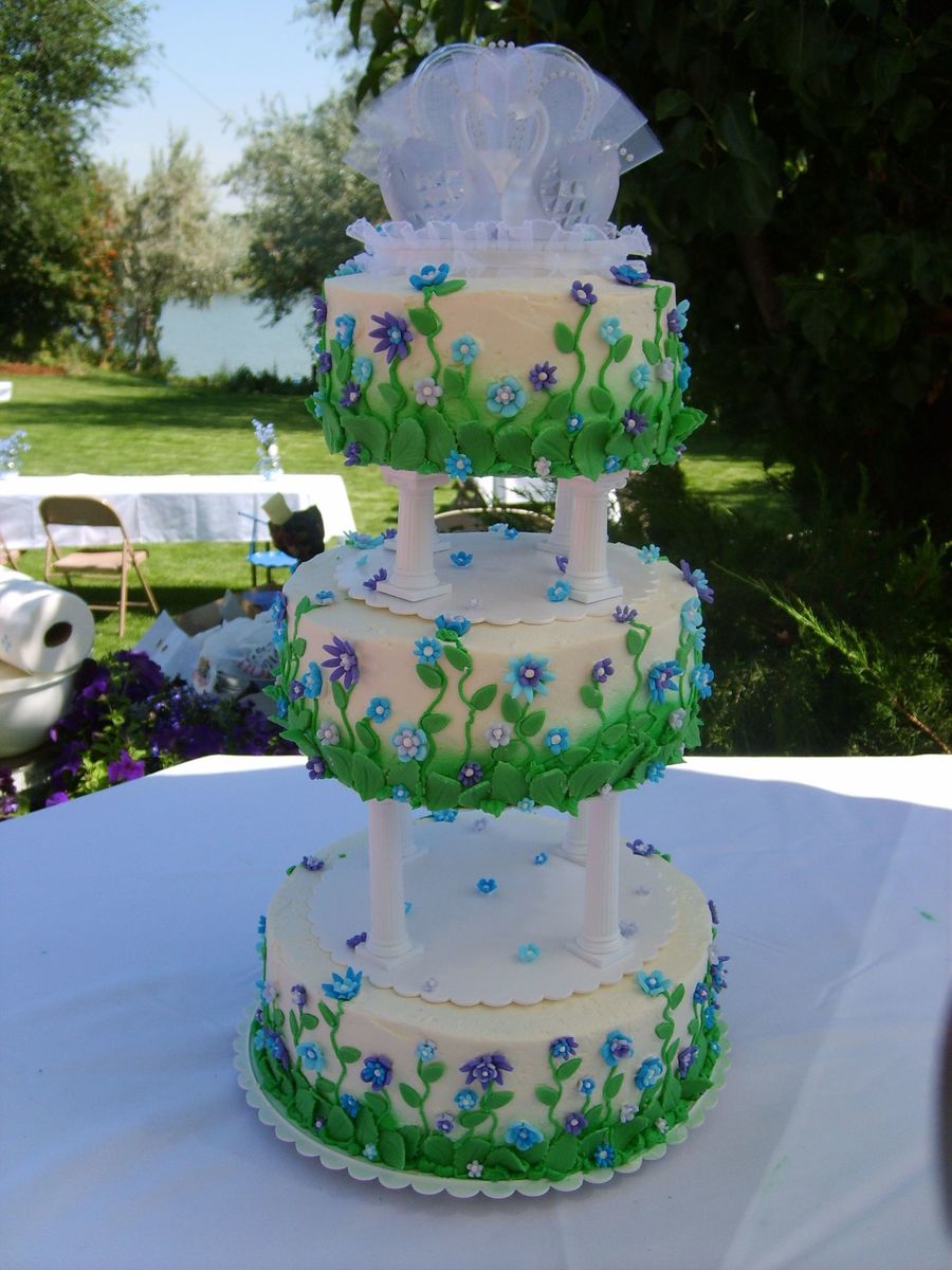 This cake was covered in buttercream and had blue and puple fondant flowers of different size in the cake with green leaves at the bottom as a border.