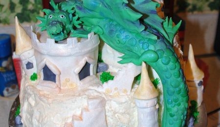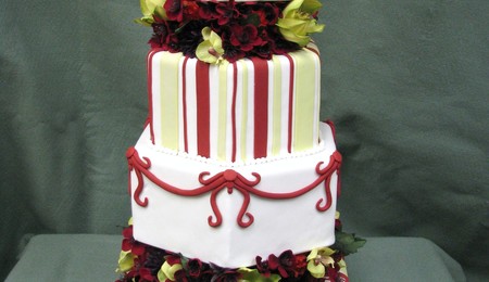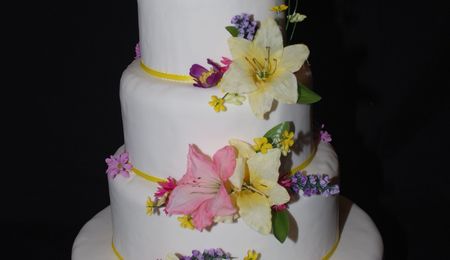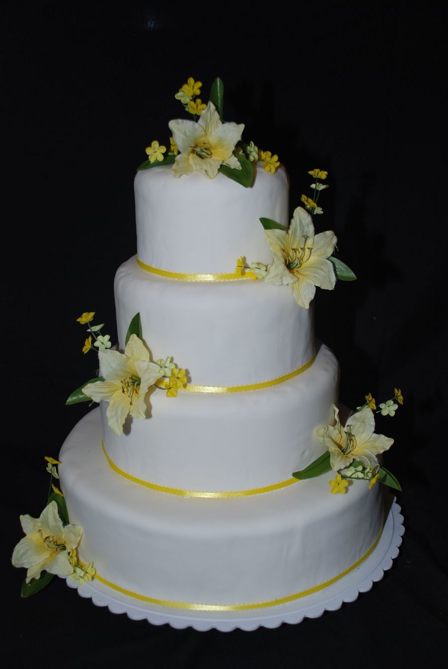 This is a fondant covered cake with yellow lilies and misc flowers.