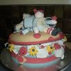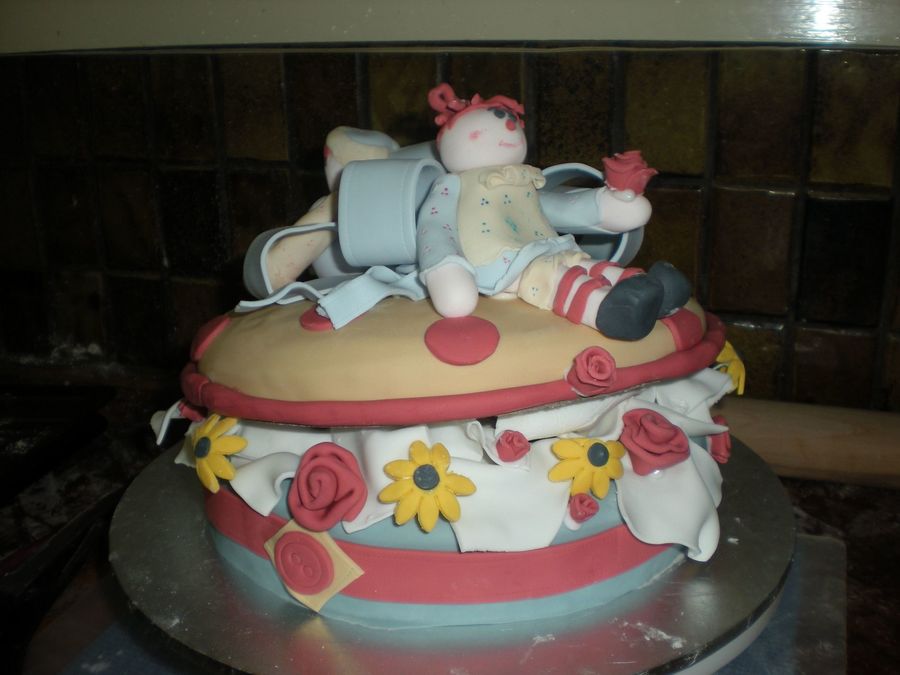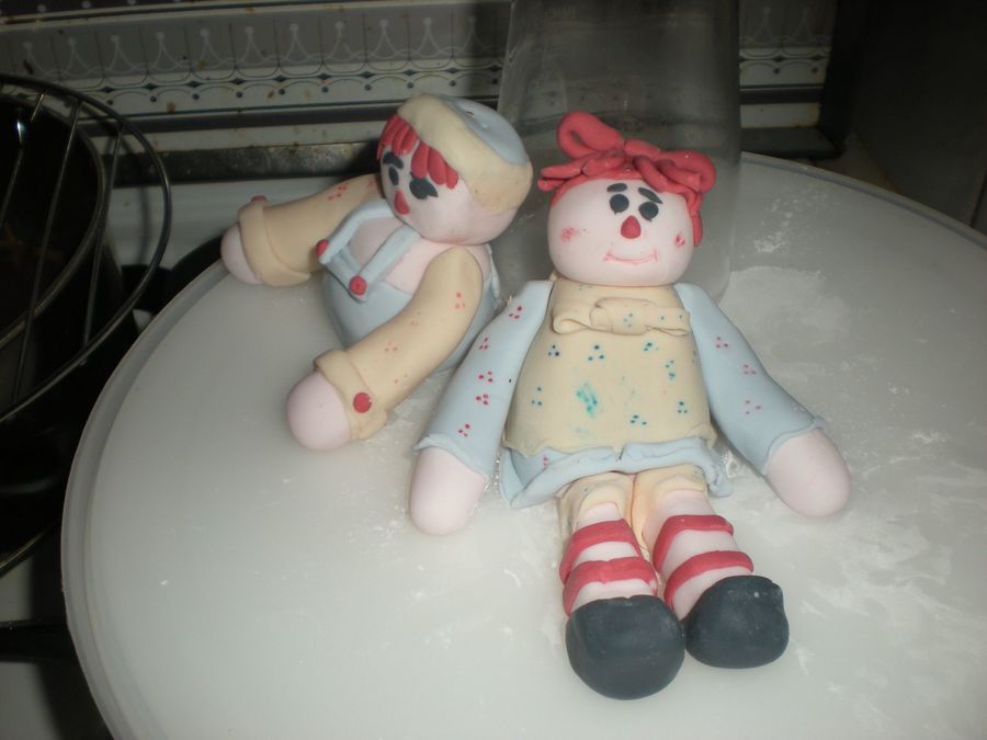 Raggedy ann and andy on sewing box. All fondant - copied from a photo on cake central -sorry I cannot remember who you are but yours was fantastic. This is my first modeling attempt. Duff roses