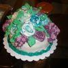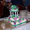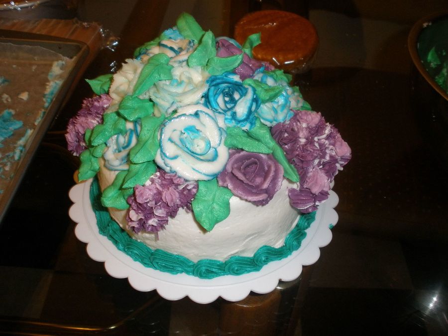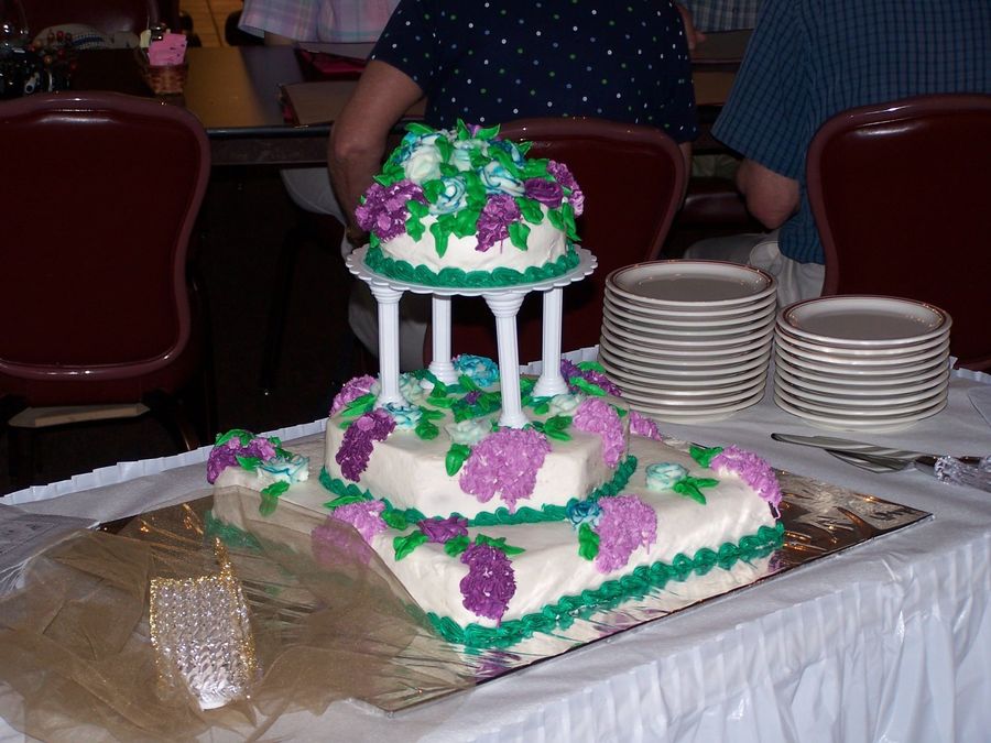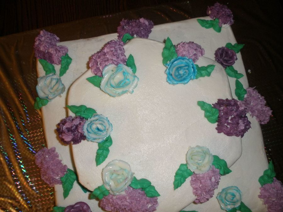 The couple are in their 70's and wanted something nice though not over the top. Square, hex, round, butter cake with raspberry filling decorated completely in buttercream.