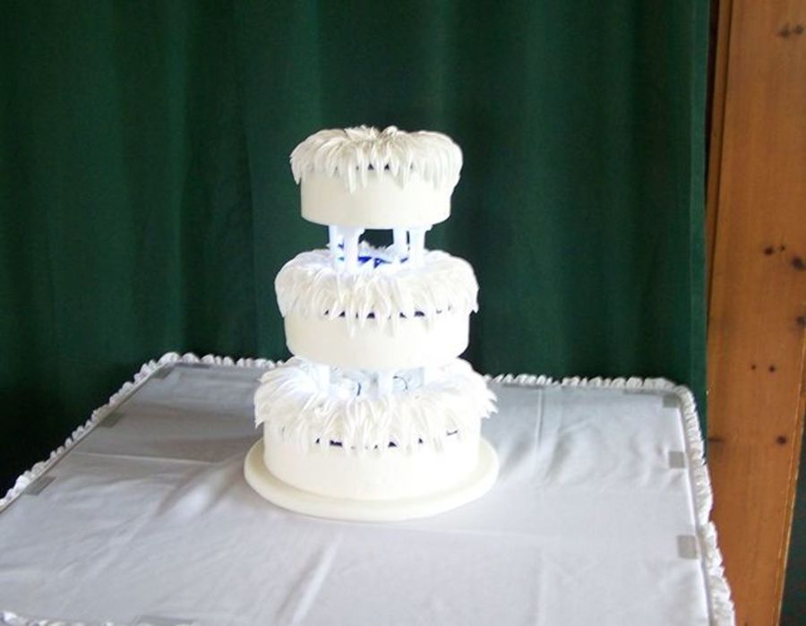 This was a long process cake. It is dairy free, 3 different flavors,vanilla w/amaretto bc, lt. choc.w/pb bc, dk choc.w/rasp.fruit. the bc's were soy replacement. I used an Italian Meringue BC (I won't use it again I didn't like it), to make the spikey petals around the top. We got the idea from Martha Stewart Chrysanthemum cake. I also used a blue ribbon around the top of each tier to match her colors, and some tiny LED lights between tiers also. Looked pretty cool in person. Thanks for looking.