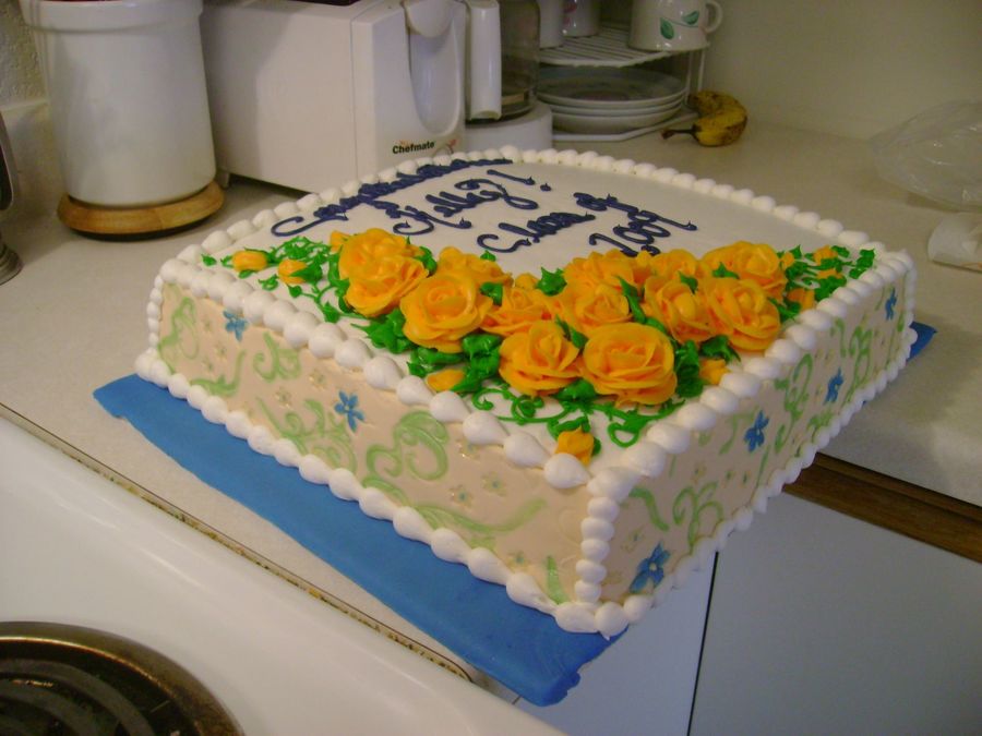 White cake with cool whip and fresh strawberry and glaze filling. Btcrm with tondant sides and btcrm roses