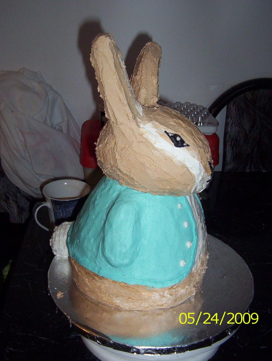This was for a baby shower. I used the wonder mold pan for the body with 2 8" round under it. The head and ears are made of rice krispies. It is covered in buttercream