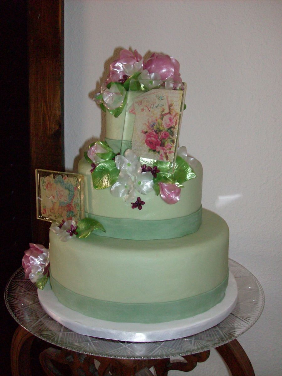 Dummy cake with pulled sugar flowers, cast sugar valentines